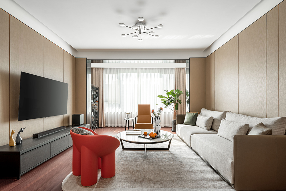 在拥有绝佳采光的客厅中,鲜亮颜色的座椅唤醒了空间的活力。绿植与果盘的点缀,营造出轻松自然的氛围。所有细节的和谐搭配,塑造出客厅的形与神。