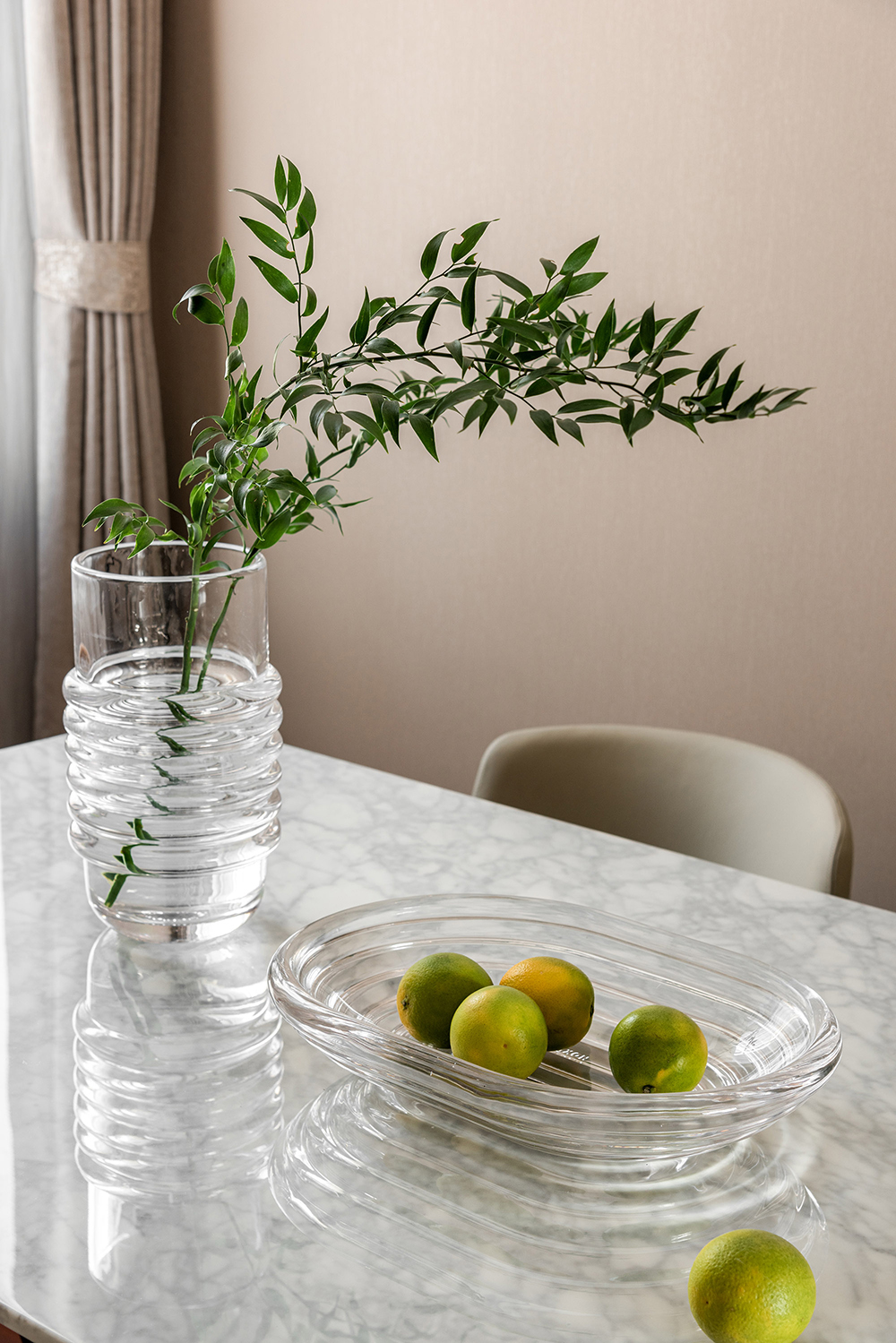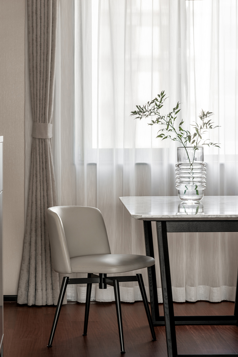 独立式餐厅能够很好地区隔出不同的空间,达到结构化设计的效果。器具别出心裁的设计为空间增添了浓厚的艺术气息,与大理石肌理的桌面形成了默契统一。在吊灯的照射下,倒映出物体之间的窃窃私语。