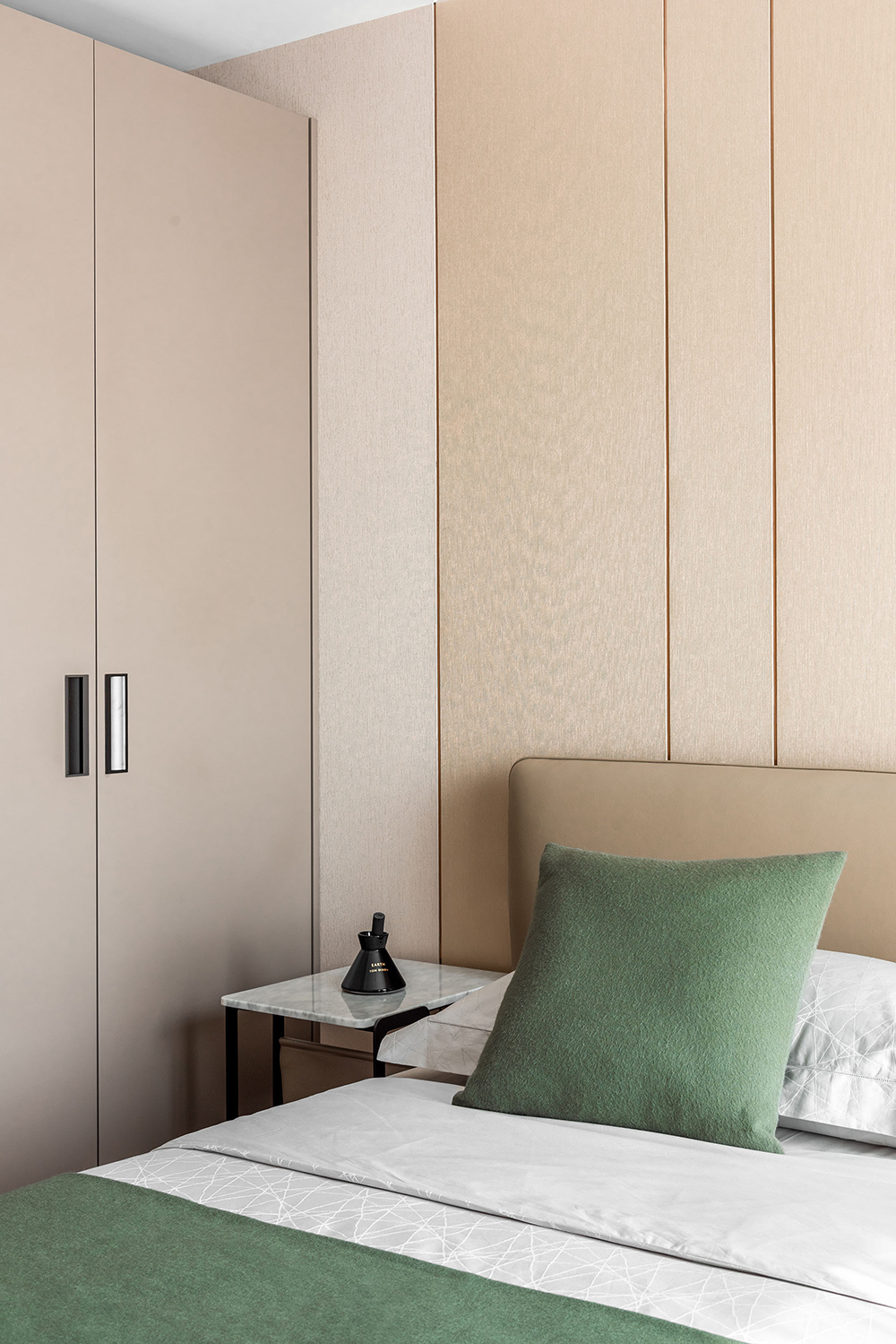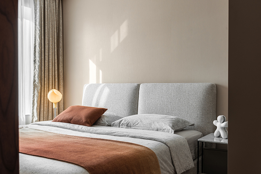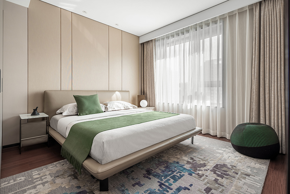 浅色系组合的主卧,似有简约而又素雅的境界。同为米色系的床体与背景墙增加了空间的协调感。艺术元素的植入,让艺术感与居住者的气场共融。