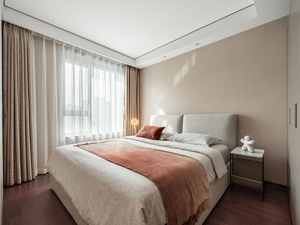 次卧延续了主卧简约素雅的感觉,让居住更加纯粹。暗红色地板、豆沙色床饰、米咖色背景墙三者之间相互呼应,使得空间更加柔和。